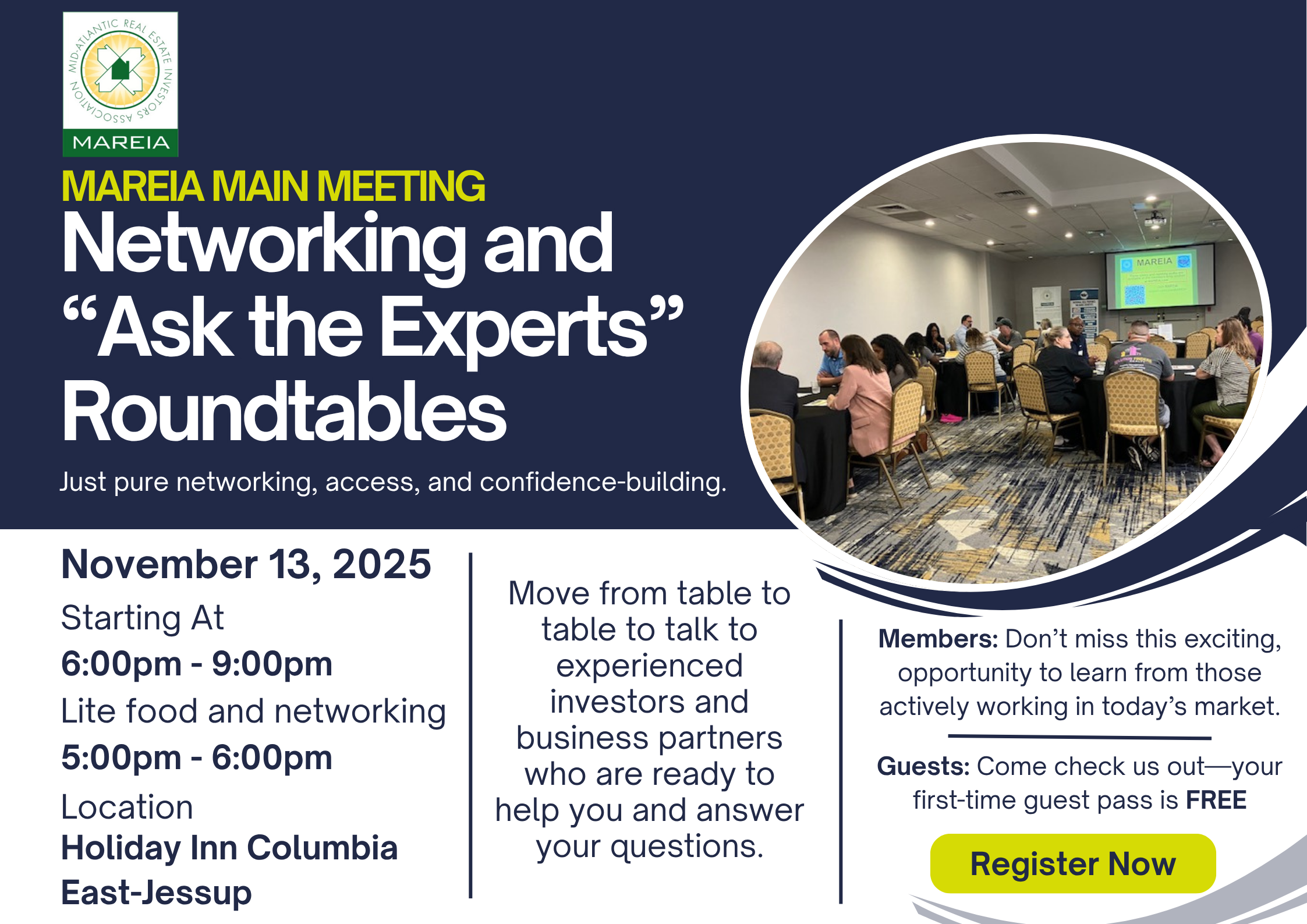 Mid-Atlantic Real Estate Investors Association is the Baltimore area's most exciting community of real estate investors, landlords, wholesalers, retailers, creative buyers, lease/option aficionados and more.